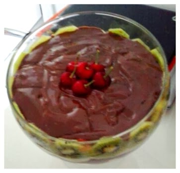 Em uma travessa alternar uma camada de creme branco, frutas picadas (de acordo com a preferência), e creme preto. Geralmente fazemos isso até preencher o recipiente escolhido. Levar a geladeira e pronto!